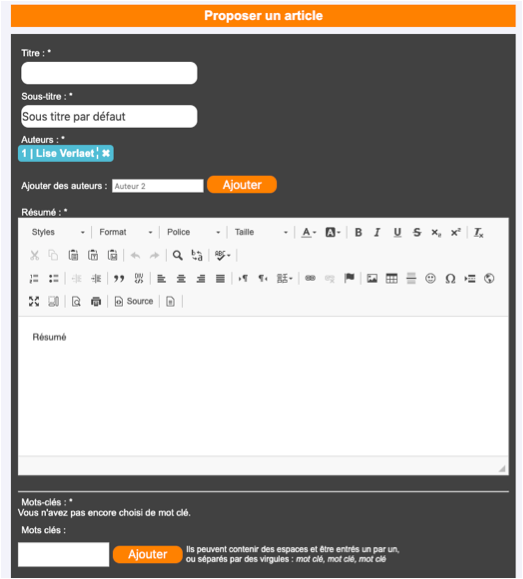 Dans la section réservée à l'article, collez le texte qui fera entre 10 et 15 pages excluant la bibliographie (équivalent format A4). Vous y inscrirez le titre, le résumé et les mots-clés en anglais voire en d’autres langues en début d’article.